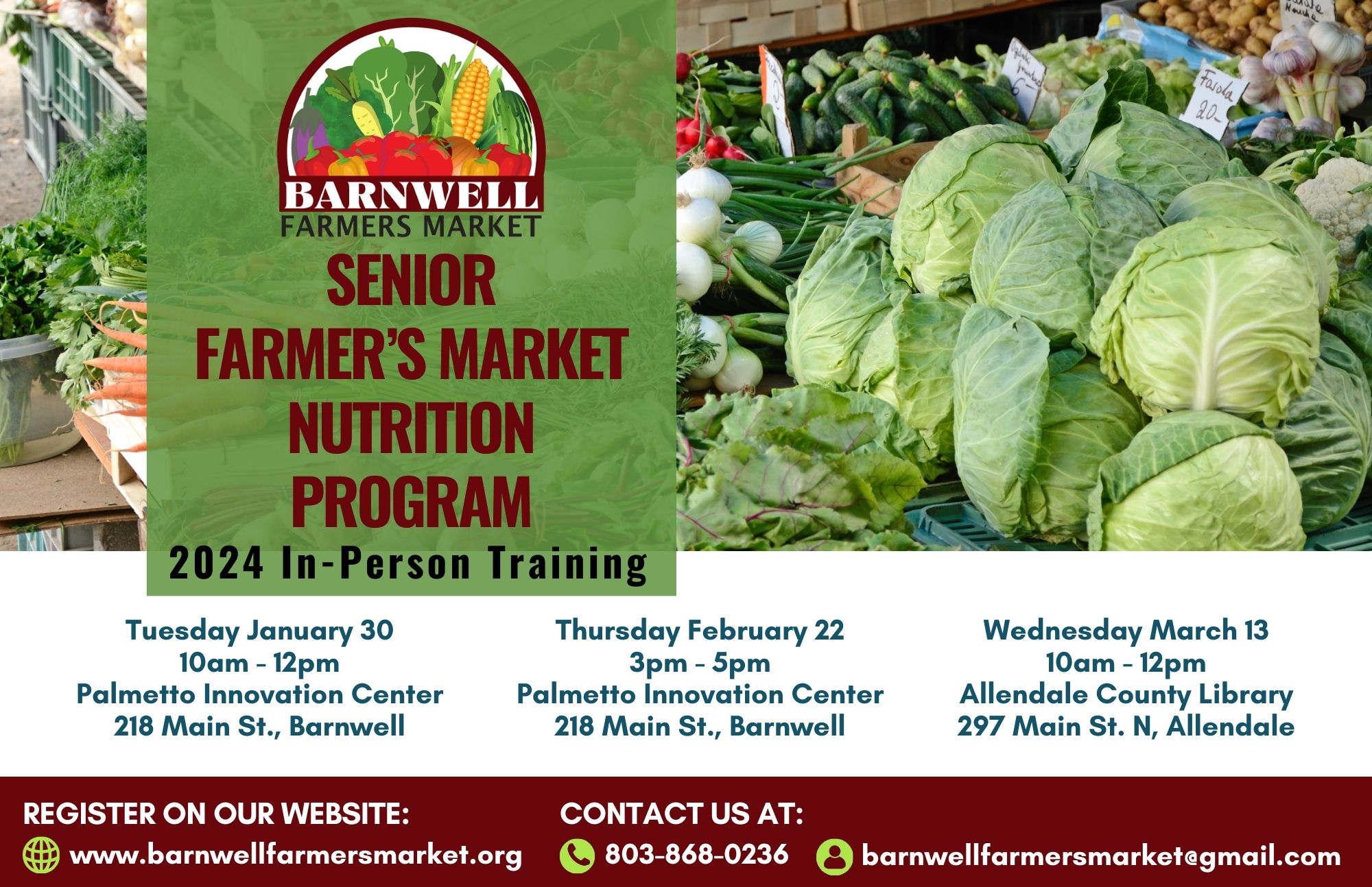 Palmetto Innovation Center 218 Main Street, Barnwell, South Carolina, United StatesThe Seniors Farmers’ Market Nutrition Program (SFMNP) is designed to increase the consumption of fresh produce through farmers’ markets, roadside stands, and community supported agricultural programs by providing low-income seniors with access to locally grown fruits, vegetables, honey, and herbs.This training is mandatory for any farmer who would like to participate in SFMNP for the 2024 season. All trainings […]